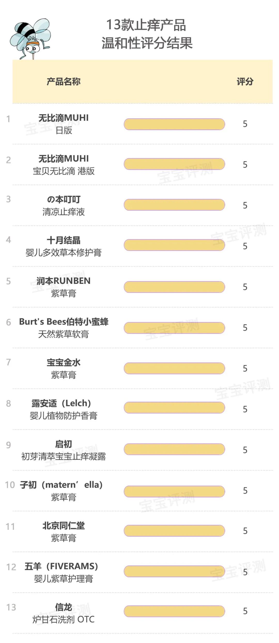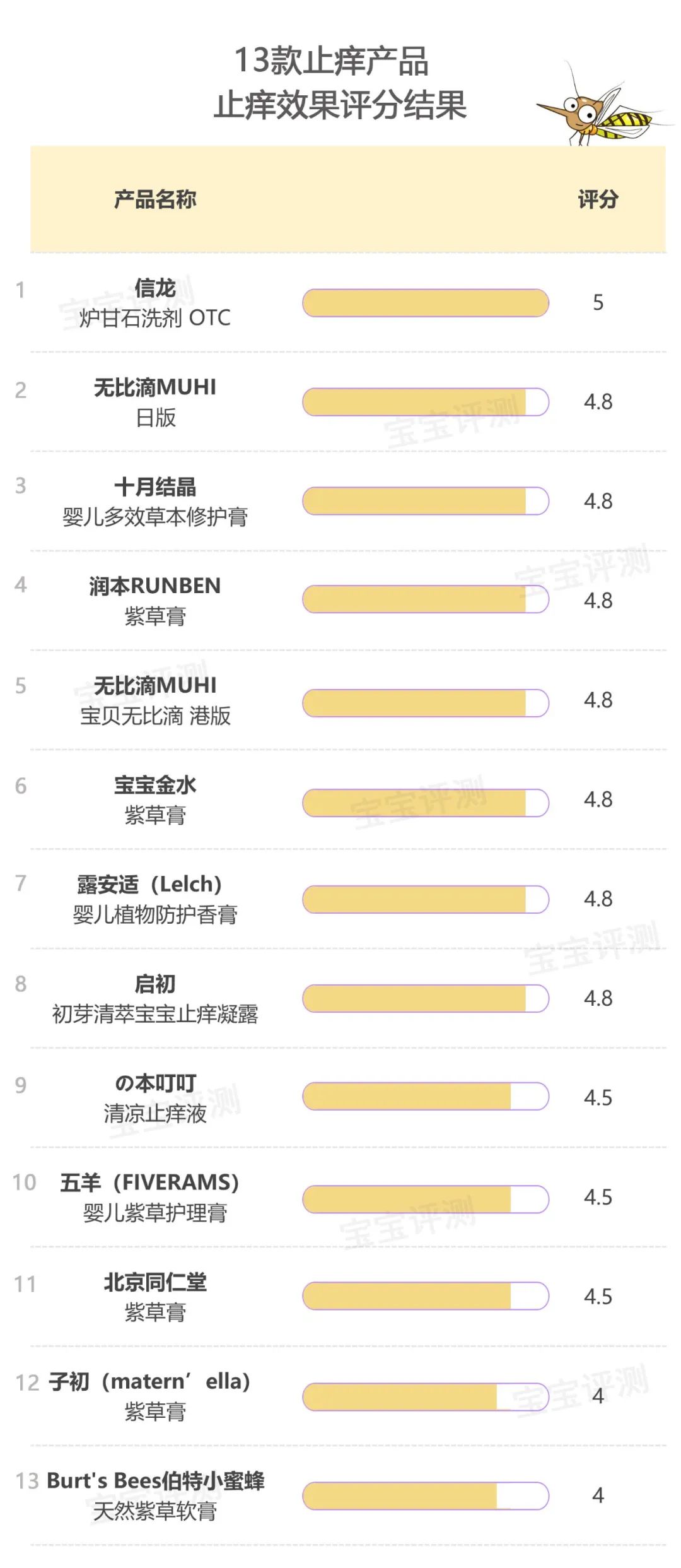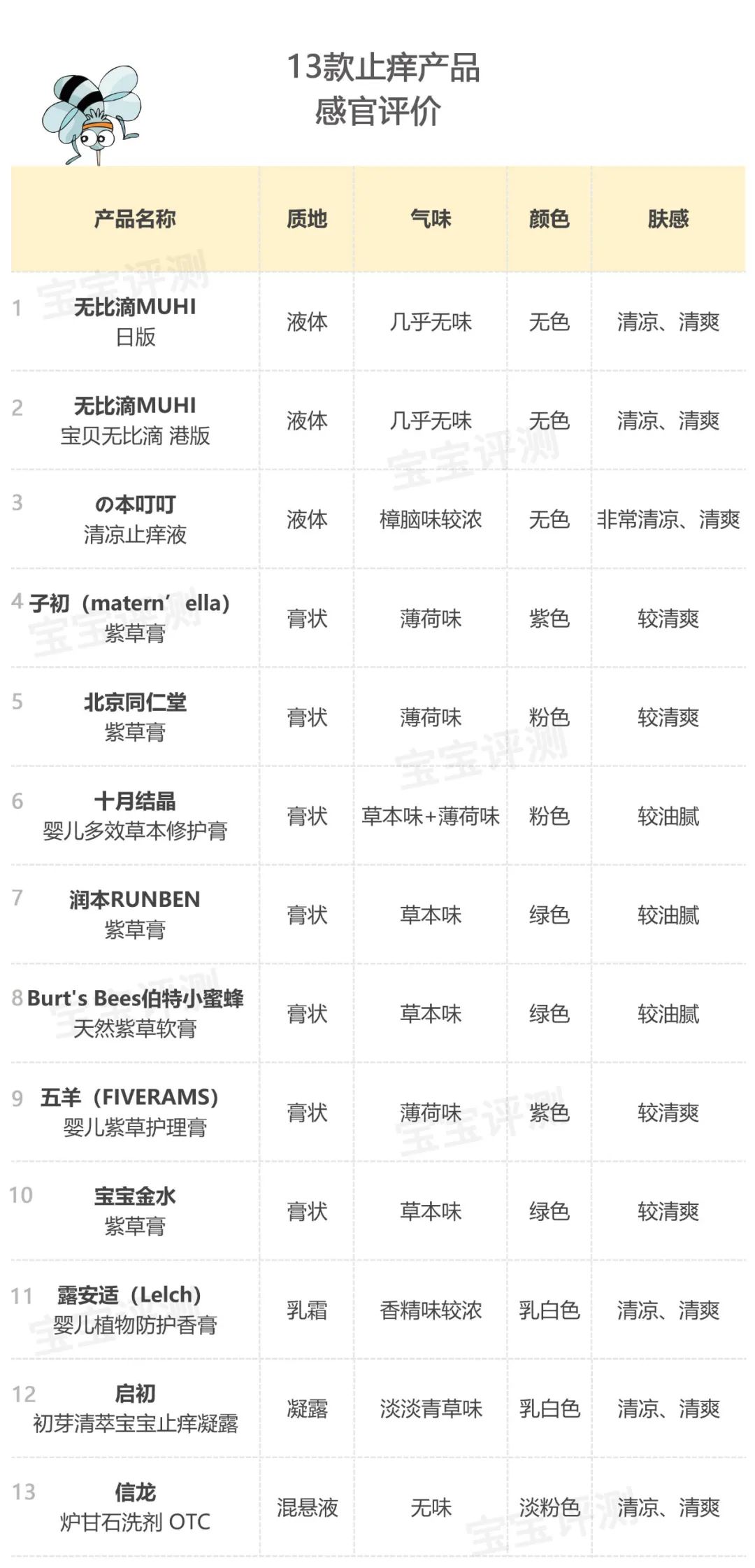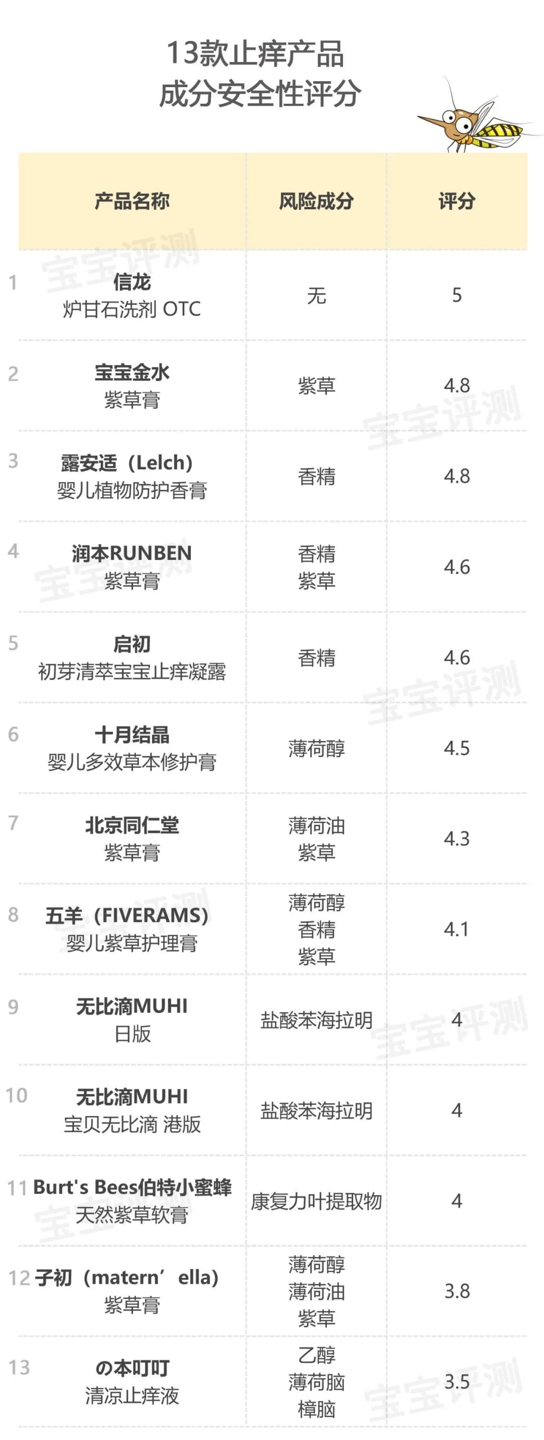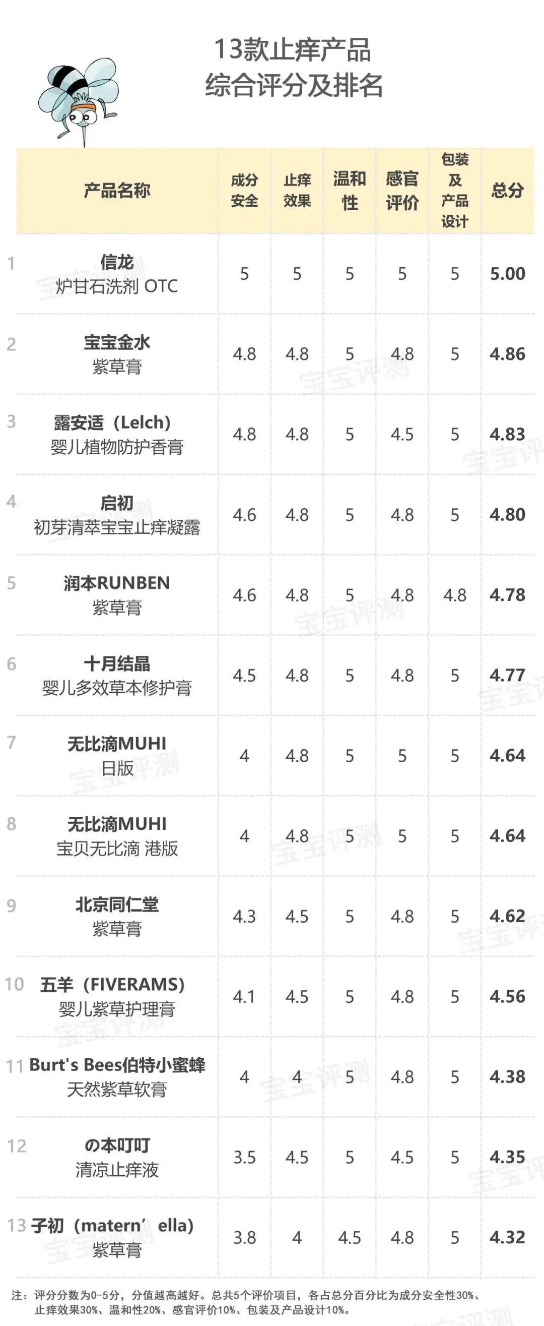 綜合起來(lái),笨爸爸給13款止癢產(chǎn)品進(jìn)行了評(píng)分,如下: