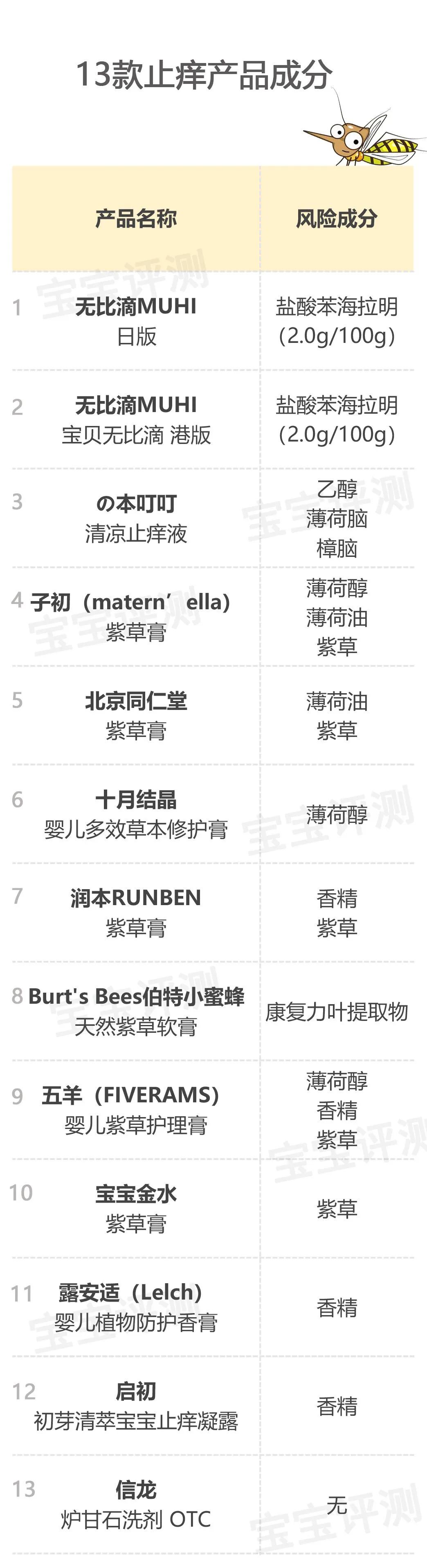 同樣地,笨爸爸不建議2歲以下寶寶使用子初、北京同仁堂、十月結(jié)晶、五羊這4款產(chǎn)品,不建議使用の本叮叮止癢液。
