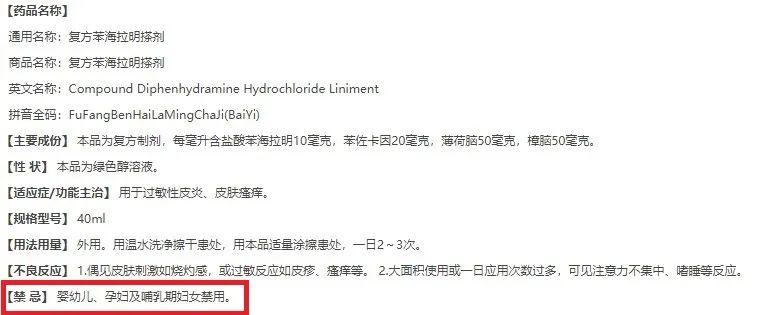 在中國(guó),含有苯海拉明成分的復(fù)方外用搽劑藥品說(shuō)明書(shū)上明確指出,孕婦、哺乳期婦女、嬰幼兒禁止使用。