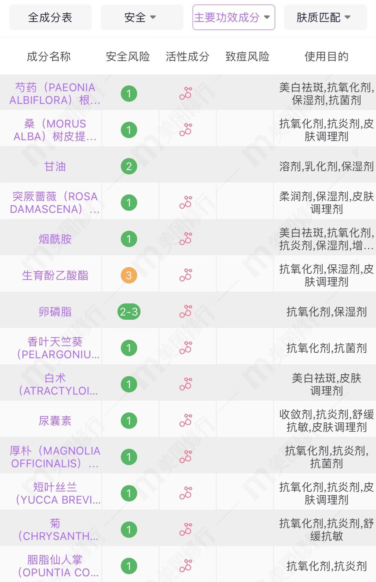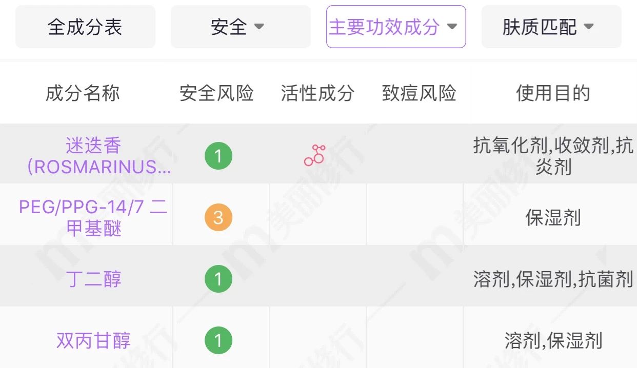 其中糖類水解物、根提取物、西班牙尾草、草籽提取物可以充分為肌膚護膚補水,對干皮和油皮特別友好。