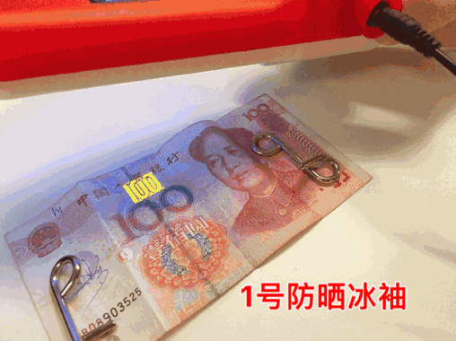 現(xiàn)場情況是這樣的,一號冰袖在罩住紫外線燈之后,仍然能找出軟妹幣上的防偽標(biāo)識。紫外光能穿過冰袖,就說明冰袖沒有起到防曬的果。