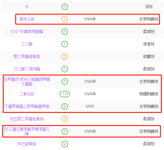 而像下面這款,主要的防曬劑是甲氧基肉桂酸乙酸乙酯(防護(hù)UVB),防護(hù)UVA的只有二氧化鈦,還有一個(gè)亞甲基雙-苯并三唑基四甲基丁基酚,但排在防腐劑后面(一般添加為1%),防護(hù)效果能好嗎?