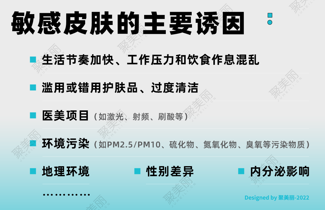科學(xué)研究表明,造成敏感肌的誘因復(fù)雜多樣,除了疫情時(shí)代長(zhǎng)期佩戴口罩之外,生活節(jié)奏加快、工作壓力或醫(yī)美項(xiàng)目等因素,以及環(huán)境污染、換季氣候變化等外部因素都可能導(dǎo)致肌膚屏障受損進(jìn)而造成肌膚敏感癥狀。