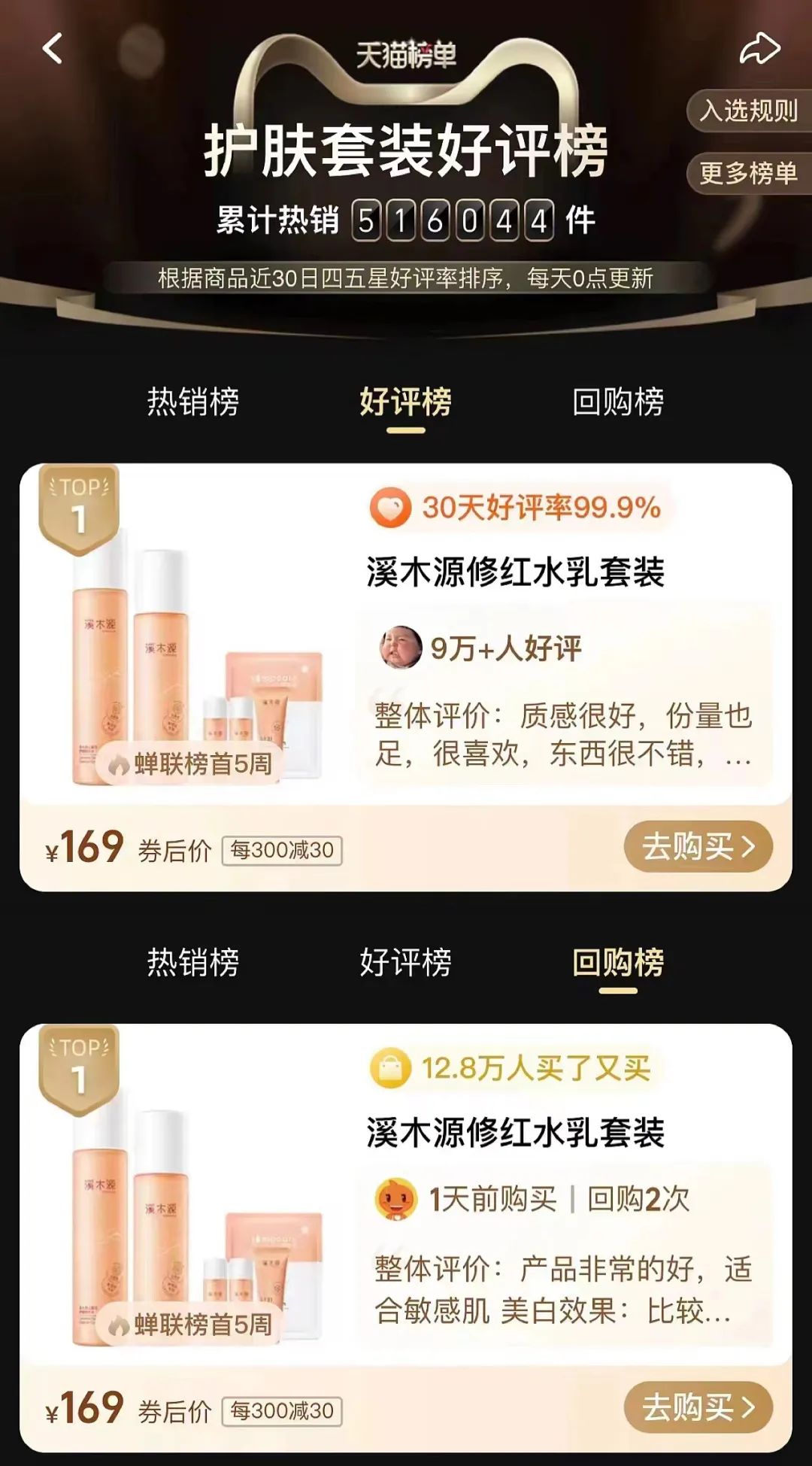 這個(gè)品牌就是溪木源,其山茶花系列則以產(chǎn)品力吸引眾多主播和達(dá)人推薦的爆款系列,時(shí)至今日也依舊是天貓護(hù)膚大子類目——護(hù)膚套裝回購榜、好評(píng)榜榜首“常客”。
