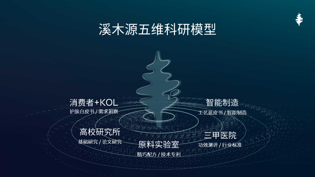 以溪木源為例,其開創(chuàng)以溪木源為核心運(yùn)轉(zhuǎn)的研發(fā)及供應(yīng)鏈模式,將“消費(fèi)者、高校研究所、原料實(shí)驗(yàn)室、三甲醫(yī)院、智能制造”五大板塊進(jìn)行整合,形成了“需求洞察、基礎(chǔ)研究、原料配方、功效測(cè)評(píng)、智能制造”的循環(huán)通路——五維科研模型。