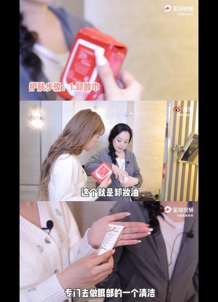 章小蕙在向徐老師分享好物的時(shí)候,就用了很長(zhǎng)的時(shí)間來(lái)說(shuō)她收工后的護(hù)膚流程,光是卸妝就要用到好幾樣產(chǎn)品。