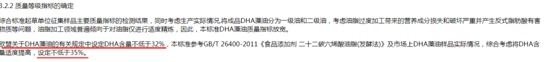 參考《LS/T 3243—2015 DHA藻油》行業(yè)標(biāo)準(zhǔn),為劃分DHA的質(zhì)量等級(jí),藻油產(chǎn)品的DHA含量應(yīng)該不低于35%,而歐盟方面則規(guī)定藻油DHA含量不低于32%。