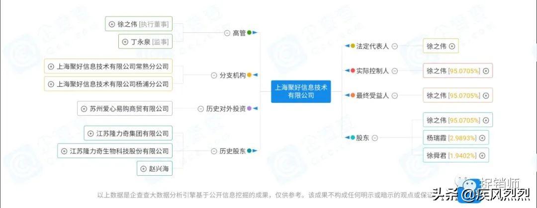 根據(jù)企查查APP數(shù)據(jù)顯示,上海聚好信息技術(shù)有限公司成立于2012年7月31日,大股東法人徐之偉持股約95%,值得注意的是,徐之偉亦是江蘇隆力奇集團(tuán)有限公司法人、大股東、董事長。