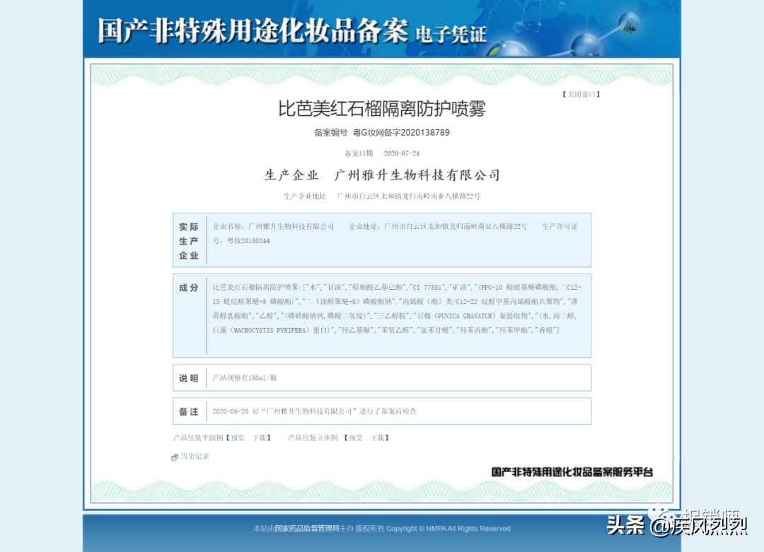 根據(jù)國產(chǎn)非特殊通途化妝品備案網(wǎng)站查詢可知,比芭美紅石榴隔離防護(hù)噴霧生產(chǎn)企業(yè)為廣州雅升生物科技有限公司,備案編號 粵G妝網(wǎng)備字2020138789,生產(chǎn)許可證號:粵妝20180244。