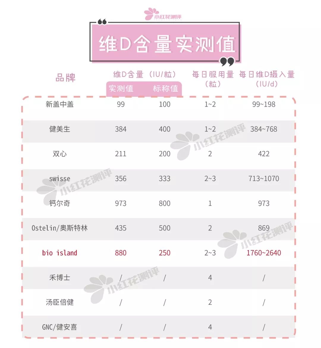 維D含量實(shí)測(cè):bio island實(shí)測(cè)值多兩倍