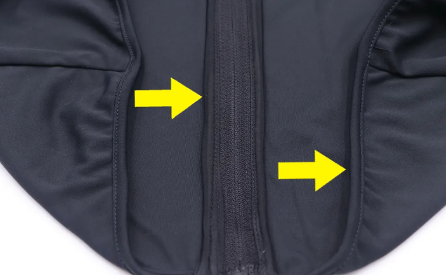 下擺處采用了本布彈力捆邊,衣服不易卷邊外翻。而翻至反面,拉鏈兩側(cè)也有相同捆邊工藝,貼身穿時(shí)不易刮蹭皮膚。