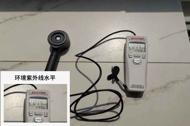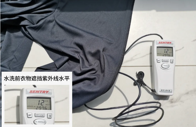 測(cè)評(píng)員用專業(yè)紫外線測(cè)量?jī)x進(jìn)行小實(shí)驗(yàn)。實(shí)測(cè)時(shí)間為中午11點(diǎn)55分,陽(yáng)光直射下環(huán)境UVAB的峰值為2844uW/cm2,蓋上未水洗和水洗五次的衣服后,分別降至了12uW/cm2、15uW/cm2。