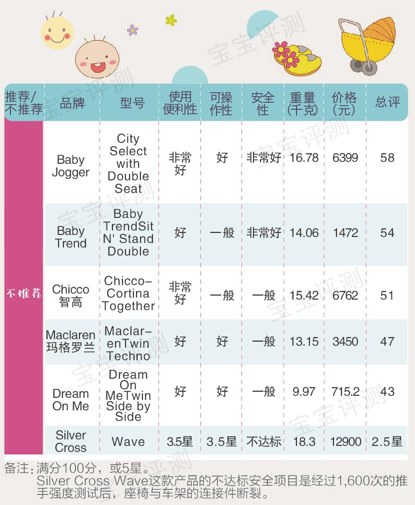 不過令人遺憾的是,雙座嬰兒車沒有一款產(chǎn)品得分在75分以上,沒有推薦產(chǎn)品,而不推薦產(chǎn)品也是所有類型嬰兒車中多的。