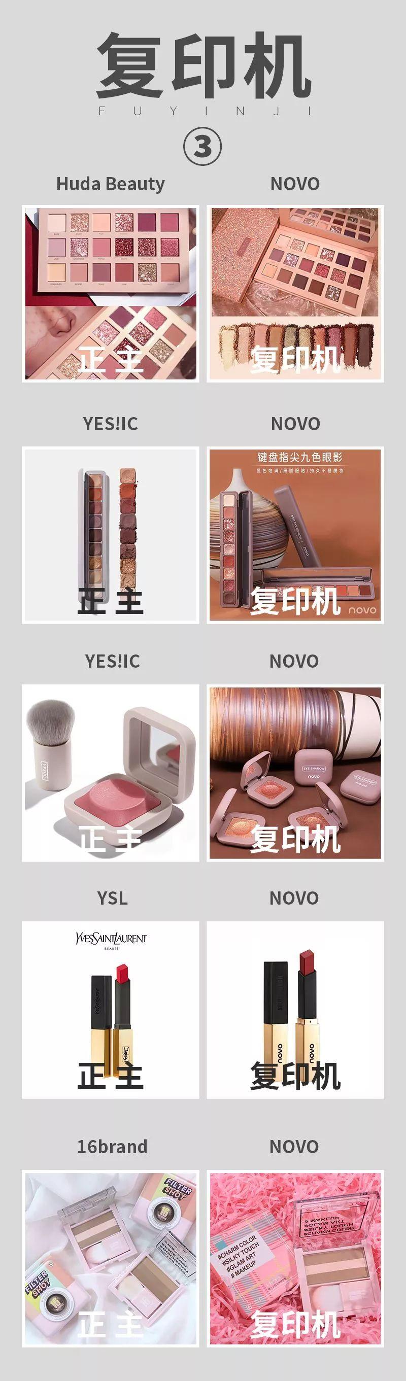 彩妝品牌NOVO的產(chǎn)品看起來(lái)眼熟度也是高達(dá)90%,而且它是無(wú)差別攻擊,不管是國(guó)外,還是韓國(guó)小眾品牌,還是國(guó)內(nèi)新銳品牌,只要是它看上的,統(tǒng)統(tǒng)都不放過(guò)。