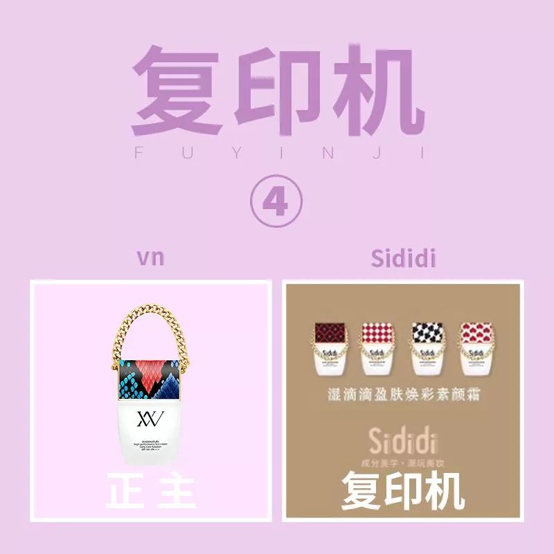 除了上述所說(shuō)的“全復(fù)印”和“90%復(fù)印”,還有更多的品牌是在出單品的時(shí)候“小抄”一下,比如Sididi這個(gè)品牌,據(jù)企查查信息是今年6月剛成立的一個(gè)品牌,剛成立就開始抄?是把抄襲作為核心能力嗎?被抄襲的韓國(guó)VN鉑金包防曬霜今年上半年可火了很久了,蹭熱點(diǎn)也不是這么蹭的吧。