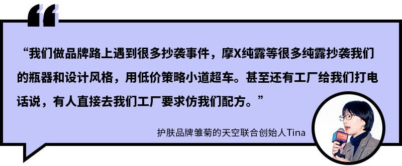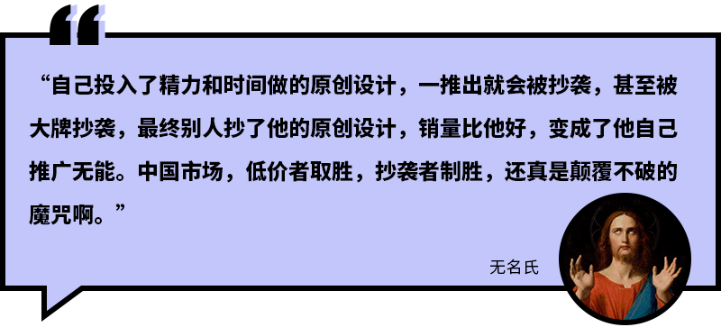 這些坐享其成的抄襲者,輕而易舉地就能摧毀新銳品牌辛苦建起的國(guó)貨好形象。而那些花大心血設(shè)計(jì)自己的產(chǎn)品的創(chuàng)始人們,遇到被抄襲的情況也是心酸又無(wú)奈。