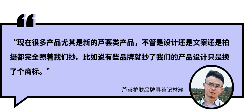 “原創(chuàng)設(shè)計(jì)肯定重要,但是后端的運(yùn)營(yíng)營(yíng)銷產(chǎn)品其實(shí)也重要,零售業(yè)不是原創(chuàng)大賽,更是一個(gè)綜合實(shí)力的考驗(yàn)。抄襲者可以抄我們的包裝,但我們的基地、5年生的庫(kù)拉索蘆薈、產(chǎn)品,包括我們的運(yùn)營(yíng)推廣團(tuán)隊(duì),我們公司的文化和精神,這些東西別人抄不了,這些才是我們品牌有價(jià)值的資產(chǎn)?!彼f(shuō)道。