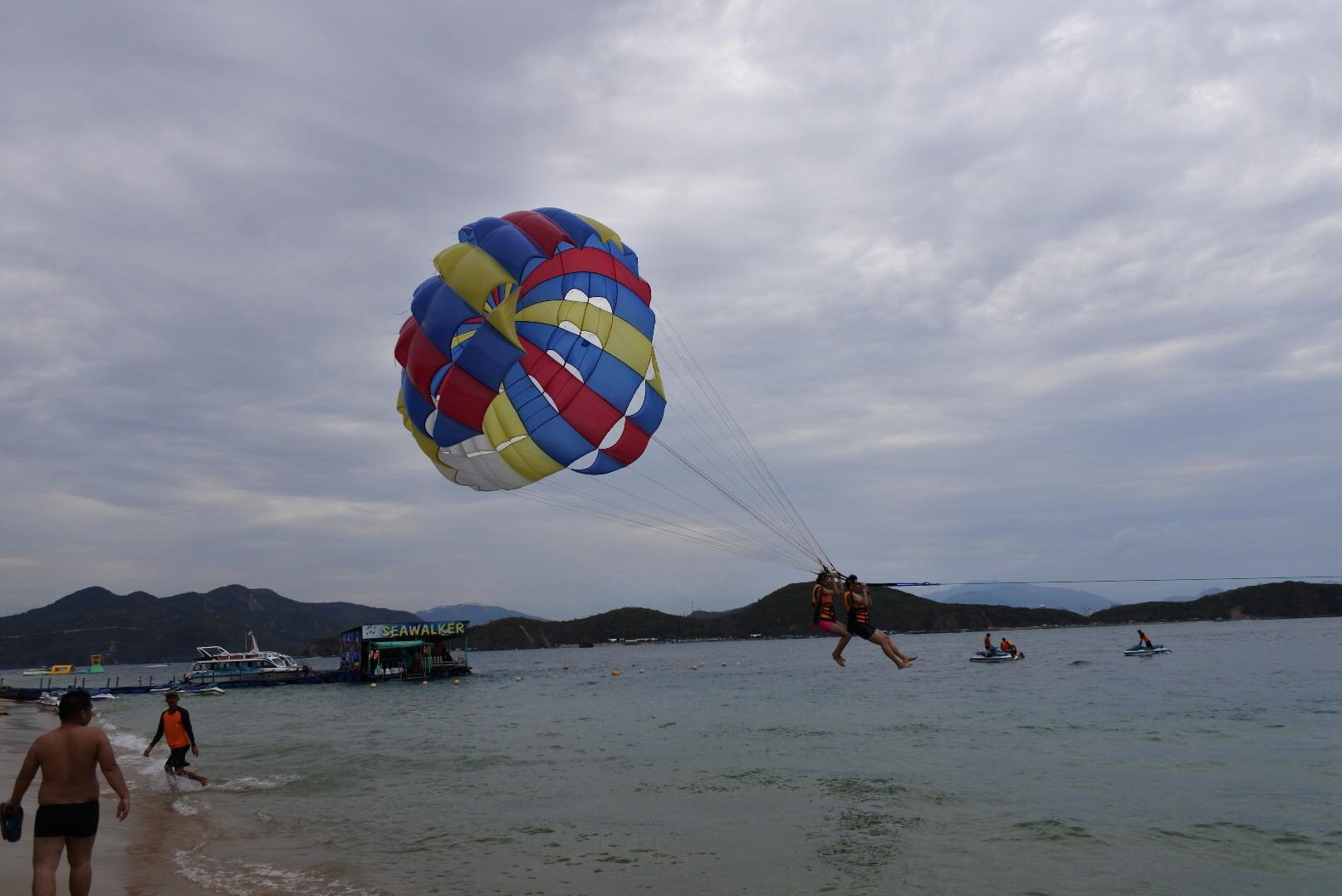 友情提示,所有海灘的座椅都是按天收費(fèi)的,我沒(méi)有用過(guò)。使用之前要談好價(jià)格。天堂灣景區(qū)有好幾處拍照的椅子和秋千,大家都是拿出手機(jī)和相機(jī)對(duì)著自己喜歡的景色、美女、帥哥拍照了。個(gè)人覺(jué)得天堂灣是越南美的海灘,海灘平整,走進(jìn)去很深的位置海水才到腰部,大家去了換好泳裝就可以玩水拍照了。海上還有其他項(xiàng)目,可以自行消費(fèi)。娛樂(lè)項(xiàng)目,滑翔傘(摩托艇)沖浪運(yùn)動(dòng)費(fèi)用是一個(gè)人 80萬(wàn)越南盾,兩個(gè)人 130萬(wàn)越南盾。