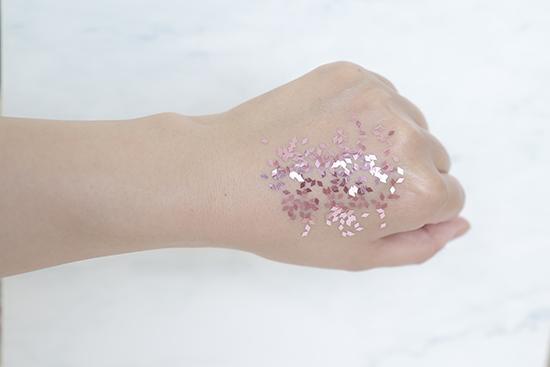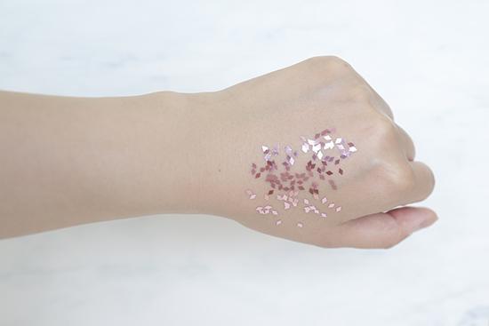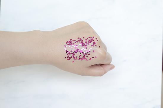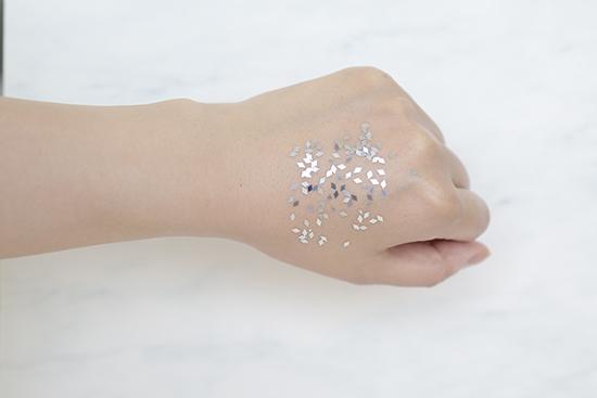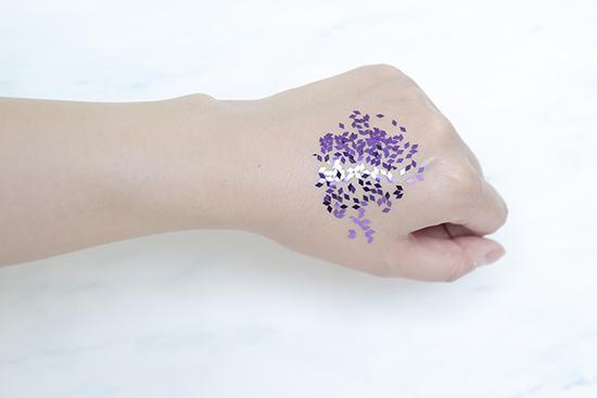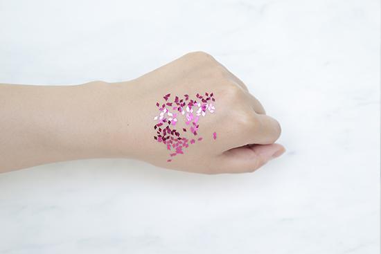 (將產(chǎn)品涂抹在手背上至吸收,再撒上相同數(shù)量的彩色亮片,用力甩手后,殘留越少證明產(chǎn)品越清爽。)