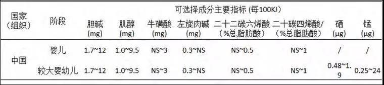4. 美國嬰幼兒奶粉法規(guī)中未明確提出可選擇成分,但對比其他可選擇成分,美國將膽堿和肌醇納入強(qiáng)制添加成分,具體指標(biāo)為:膽堿(1.7~NS),肌醇(1~NS)。