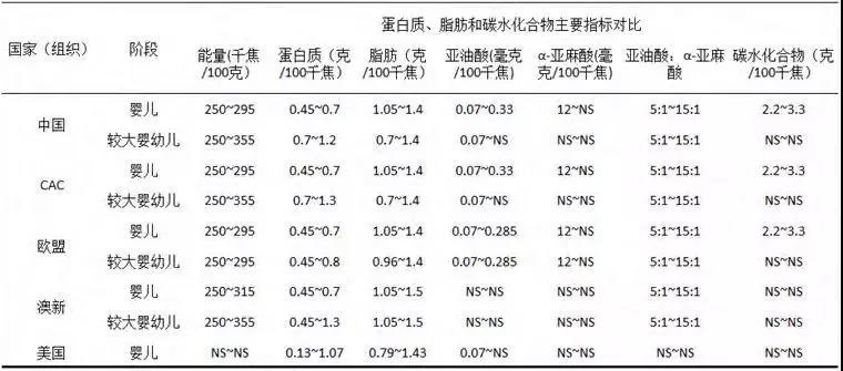 4. 在碳水化合物方面,國標(biāo)與CAC、歐盟的相關(guān)標(biāo)準(zhǔn)一致;澳新奶粉標(biāo)準(zhǔn)中未具體說明碳水化合物的含量,而是通過蛋白質(zhì)、脂肪和熱量間接控制;美國則未具體說明。