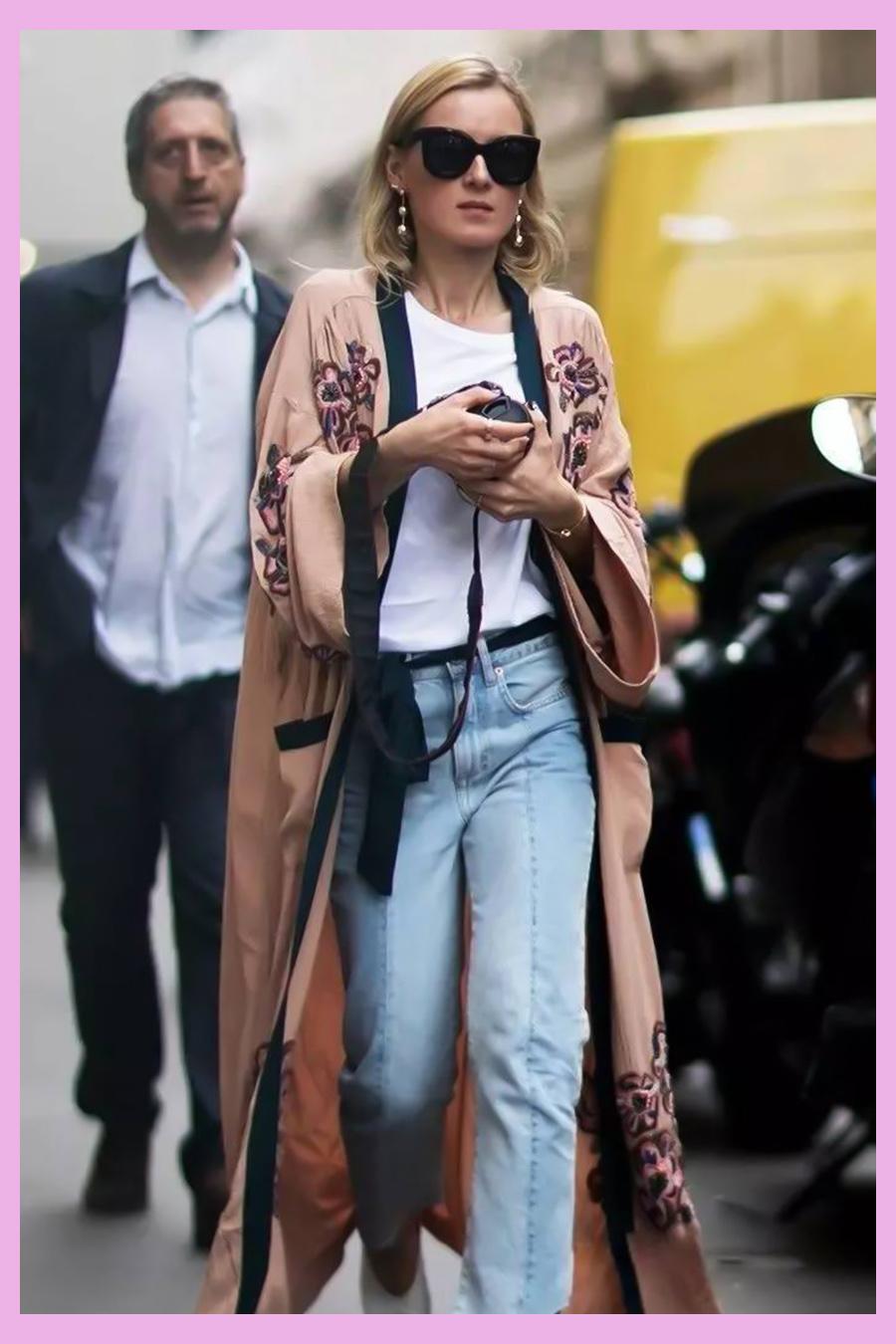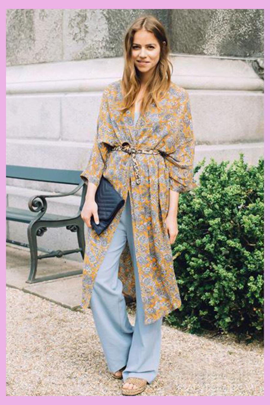 這款黃色搭配淡藍色的印花開衫顏色豐富,款式簡單,腰帶收腰加強了整體的修身果,能夠很好地修飾腰部的曲線,同時淡藍色印花能夠很好地和褲子的顏色呼應起來,彼此襯托,今夏你就是優(yōu)雅的少女了。▼