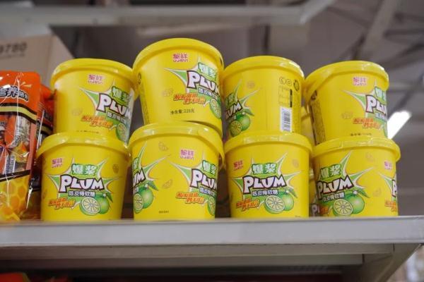 一款黃色桶裝品名為爆漿陳皮梅軟糖的商品未明碼標(biāo)價,執(zhí)法人員現(xiàn)場責(zé)令商家進(jìn)行整改。