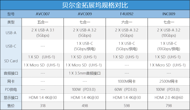 這次我們收到的四款貝爾金擴展塢分別是兩款不帶網(wǎng)卡的AVC007(五合一)和AVC009(七合一),以及兩款帶有網(wǎng)卡功能的F4U092(六合一)和INC009(七合一)。