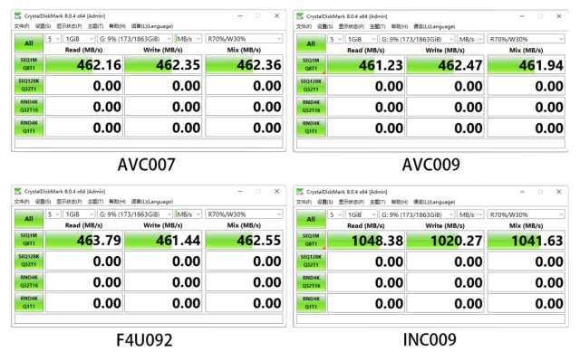 實測AVC007,AVC009以及F4U092三款擴展塢的USB讀寫速度基本都在460MB/S左右,基本上符合5Gbps帶寬的一個傳輸速度。而INC009的讀寫速度則超過了1000MB/S,同樣符合10Gbps的帶寬。