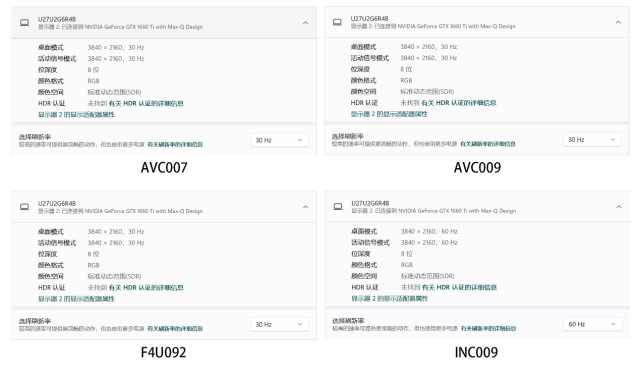 HDMI接口方面,我們直接用筆記本電腦的雷電接口外接一臺4K144的高刷顯示器,來看看HMDI接口的一個傳輸帶寬。實測AVC007,AVC009以及F4U092三款采用HDMI1.4接口的擴展塢都能夠傳輸4K30Hz8bit全范圍RGB的一個視頻信號。采用HDMI2.0接口的INC009只能夠傳輸4K60Hz8bit全范圍RGB的視頻信號。