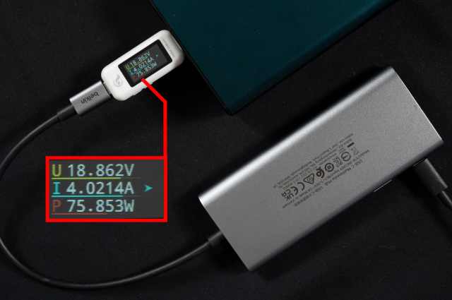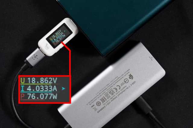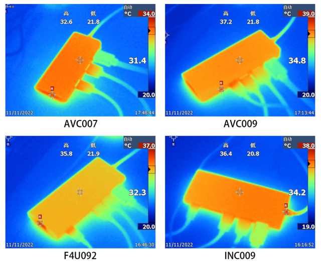我們用100W的充電頭作為供電輸入,實測INC009和AVC009的充電功率可以達到76W,供電速度還是相當給力的,基本上能夠滿足絕大多數(shù)輕薄本的一個供電需求。F4U092的充電功率則為55W,表現(xiàn)同樣十分不錯。