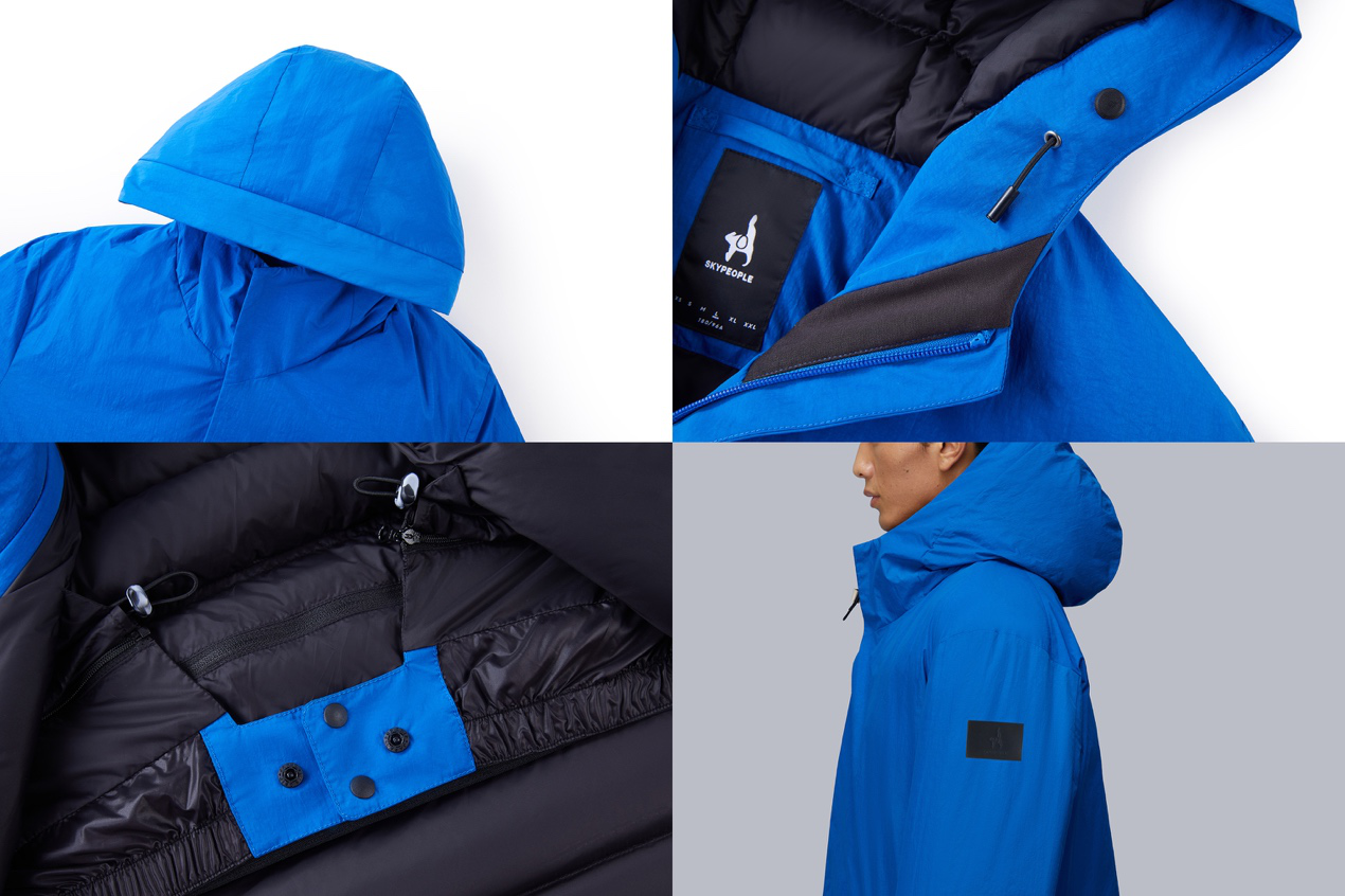 從職業(yè)人士通勤和差旅的需求出發(fā),SKYPEOPLE在羽絨服的設計中都植入巧思。一方面是考慮到脖頸、腰部、袖處等極易灌風,防風袖、Warm-bar充絨系統(tǒng)、雙層風雨帽等設計應運而生,讓職場人士在通勤、差旅途中不懼風雪。