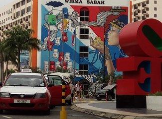 剛好那天是馬來(lái)人的新年街上基本上沒(méi)有什么人,鋪面也關(guān)門(mén)了,亞庇這邊的口味很廣東化,三個(gè)人轉(zhuǎn)啊轉(zhuǎn)都沒(méi)有找到吃的,就像霜打了的茄子,后面在一家餐館幾個(gè)人的吃了炒粉,炒面7.5馬幣馬一份(下圖),街上那天格外的安靜,走在路上感覺(jué)時(shí)間都靜止了一般,路上隨處可見(jiàn)的鴿子。晃晃悠悠或許是吃貨本質(zhì)的特性我竟然走去了亞庇市場(chǎng),這里是我愛(ài)的地方了,里面的水果琳瑯滿(mǎn)目的掛滿(mǎn)了重點(diǎn)是很便宜,東南亞的水果真心贊啊,榴蓮,山竹,紅毛丹,鳳梨,木瓜,還有馬來(lái)當(dāng)?shù)氐乃?,我和我的小伙伴吃了一路,亞庇?dāng)?shù)厝苏娴暮芎?,買(mǎi)東西前你可以先試吃,好吃在買(mǎi),不好吃笑著說(shuō)SORRY就可以,人家依舊熱情,更難得是東西不好吃,也可以換,想想我們?nèi)I(mǎi)榴蓮因?yàn)橛X(jué)得味道不好,店主嘗試后免費(fèi)幫我們換了三個(gè)直到他覺(jué)得好吃。(原諒我只記得吃而忘記拍照,這邊買(mǎi)水果都可以和店主講價(jià))因?yàn)閷?shí)在是沒(méi)有什么人,于是我們決定去逛亞庇商場(chǎng)(這邊商場(chǎng)一般是10點(diǎn)才上班開(kāi)門(mén))愛(ài)美女士可以去買(mǎi)護(hù)膚品和化妝品,比國(guó)內(nèi)還是優(yōu)惠些,下圖就是商場(chǎng)旁邊的涂鴉很有味,商場(chǎng)對(duì)面有比較有特色的涂鴉感興趣的可以去看下。