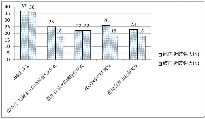 下圖列出了撕破強(qiáng)力較高的五款樣品,撕破強(qiáng)力越高,衣服的耐穿性能也越好。