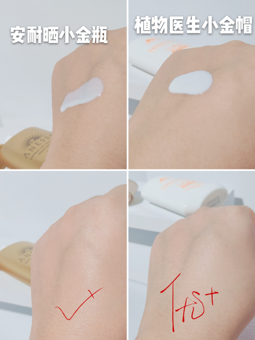 區(qū)別在于安耐曬小金瓶對(duì)干皮友好,油皮、混油慎入,建議周圍有朋友在用的話,可以先試試再下手,200+買回來(lái)不合適真的就很難受了。植物醫(yī)生小金帽成膜后是空氣感,油皮、混油不用擔(dān)心悶痘、閉口這些,主要才幾十塊,沒(méi)有海外稅這些,性價(jià)比更高。