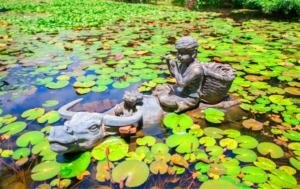 在一個(gè)池塘里看到這個(gè)雕像雕刻的栩栩如生小牧童坐在牛的背上吹著笛子、只可惜池塘里的荷花視乎還沒有到開放的季節(jié)。