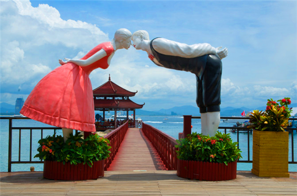 在蜈支洲島也有著美麗的傳說而這情人橋,原是座鐵索橋,是當(dāng)年守島部隊(duì)的海上瞭望點(diǎn)。走在搖搖晃晃的鐵索橋上,需要幾分膽量和機(jī)靈。有些小姐既想過橋到瞭望點(diǎn)里體會一下,又怕掉進(jìn)海水里,過橋時(shí)緊緊抓住朋友的手不放,因此這橋又被戲稱為“情人橋”。后來該島為客人著想,故將原來的鐵索橋改造成如今的木板橋。