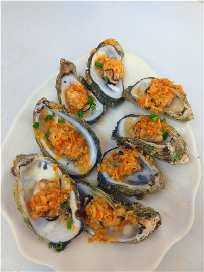這也是服務(wù)員建議我清蒸比較好吃就聽她的了、這叫牡蠣開始我也不知道叫什么是賣海鮮的阿姨告訴我的常見的吃法就是清蒸了上面放的是蒜蓉很香、味道極為鮮美。