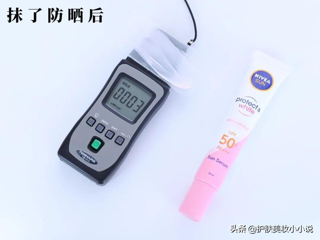 為了驗(yàn)證它是不是真的有這么強(qiáng),莉耶拿紫外線測(cè)試儀器進(jìn)行了測(cè)試。室外紫外線的初始值是313μw/cm2,然后將防曬抹在塑料薄片上再測(cè)一次,發(fā)現(xiàn)紫外線數(shù)值立馬下降到了3μw/cm2!可見防曬效果確實(shí)不是虛的!