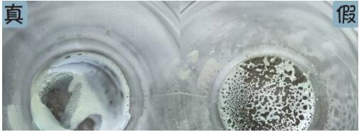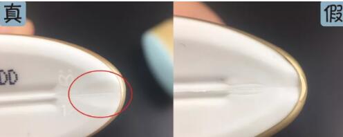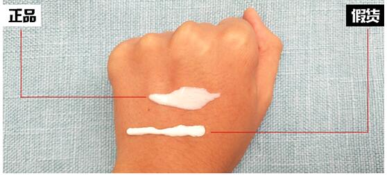 從質(zhì)地上區(qū)分,的質(zhì)地是類似于涂改液狀的液體,而仿冒品類似于牙膏狀的膏體。