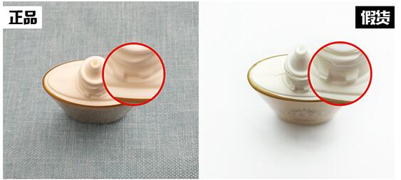 瓶子壓嘴的邊緣,在工藝上制作上會(huì)有特別的小細(xì)節(jié):出液孔偏細(xì),假貨出液孔直上直下。