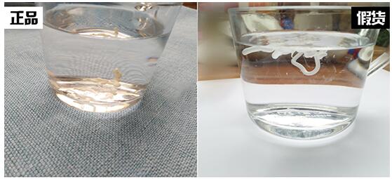 放入水中會(huì)沉入水底,而仿冒品的膏體放入水中則會(huì)漂浮在水面,可以看出仿冒品的密度是低于水的密度。