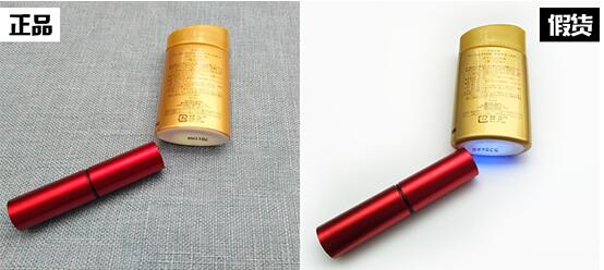這里我們利用紫光燈照射瓶底,可以發(fā)現(xiàn)的瓶身不含有熒光劑,而仿冒品的瓶身含有熒光劑。