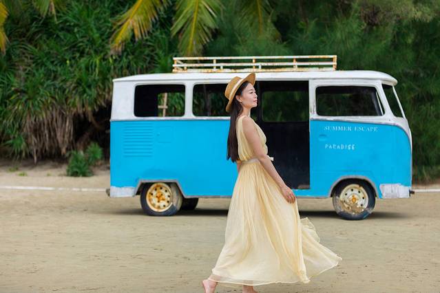 往前走了一小段,幾乎沒有人了,我們便開啟了拍拍拍模式。椰樹,小船還有復(fù)古的小車,這里和 三亞灣相比,海更藍(lán),人更少,也很安靜。