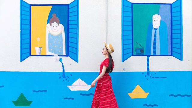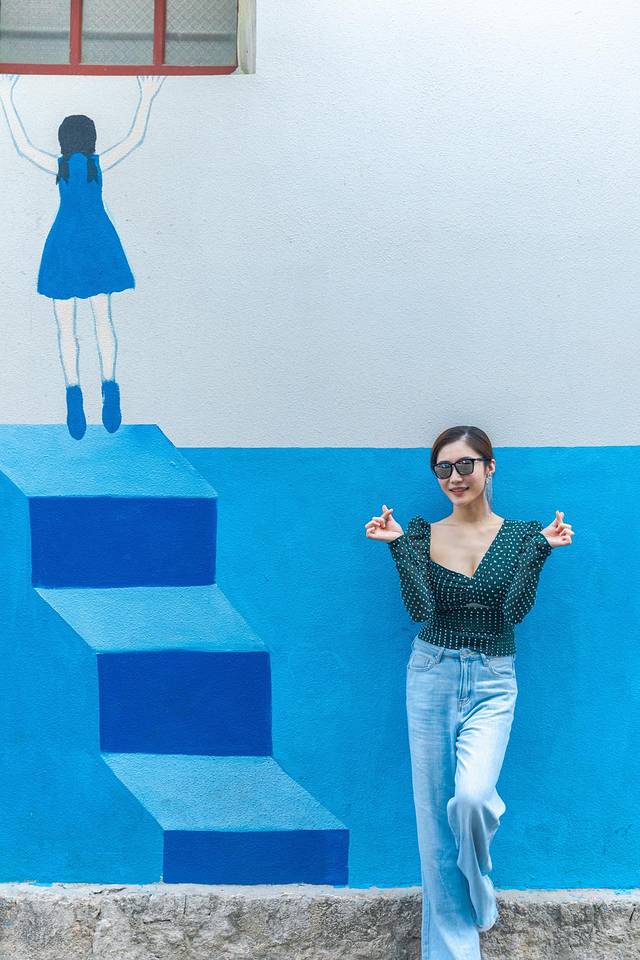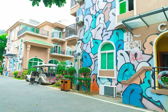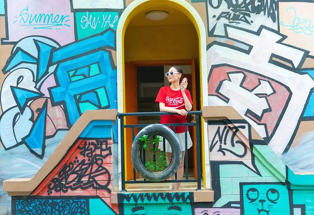 這個(gè)街巷里兩旁都是酒店,酒店外墻都被涂上了五顏六色的墻繪,巷子不長,逛逛很快就結(jié)束了。