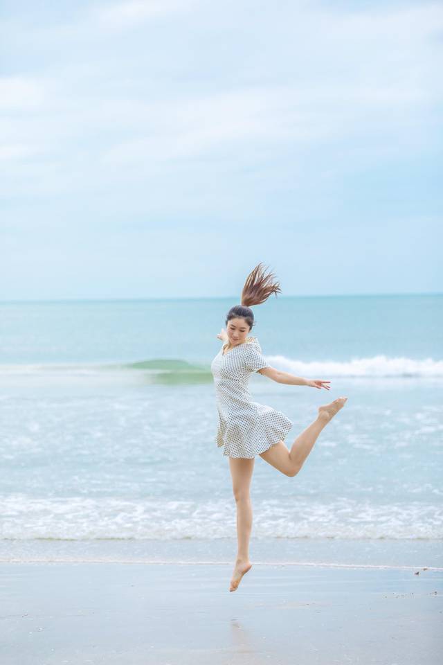 往沒人的地方走了走,在夕陽之下,水面上一片光亮,這里沒有游客,只有幾個(gè)可愛的孩子撿著貝殼,歡笑聲不斷。閨蜜以前學(xué)的是舞蹈專業(yè),終于看到大海了,相當(dāng)興奮,開始在海邊跳了起來。