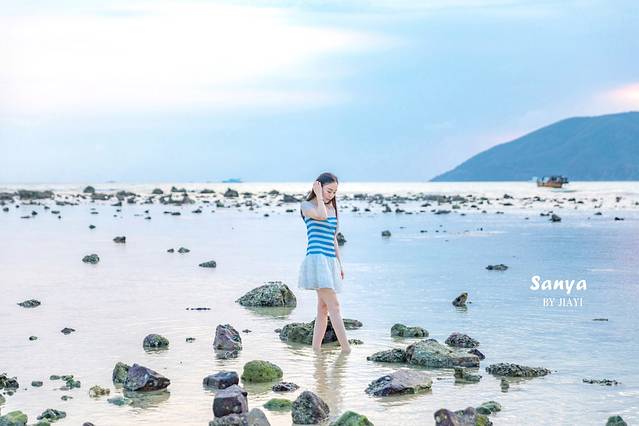 亞龍灣的海灘在這幾個(gè)灣里是好的,水清沙白,不在海邊走走真的會(huì)很遺憾。下午五點(diǎn)左右,我們來到酒店海灘邊,這片海灘人比較少,更特別的是還有巖石,坐上去就是大片的即視感。