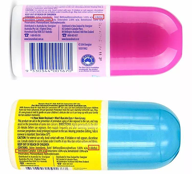 而在香蕉船的2款嬰幼兒走珠型防曬霜,都使用了4-MBC,并且都是大量4%。