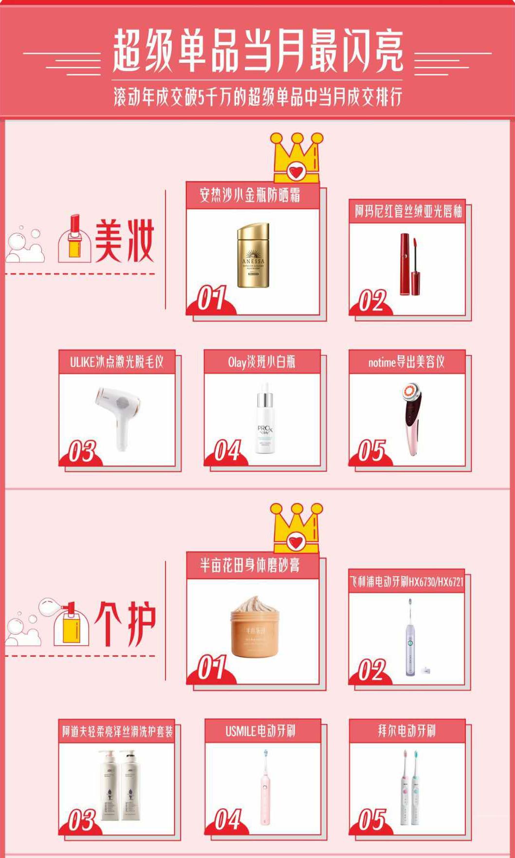 榜單還公布了美妝、個(gè)護(hù)和家清三大品類中年成交破5千萬(wàn)的“單品”。在這份當(dāng)月成交排行榜單中,美妝部分TOP排行榜除了防曬霜、口紅等護(hù)膚品,ULIKE冰點(diǎn)激光脫毛儀和notime美容儀器也成功超越其他若干美妝產(chǎn)品,排名第3和第5。