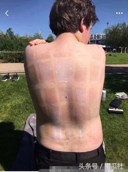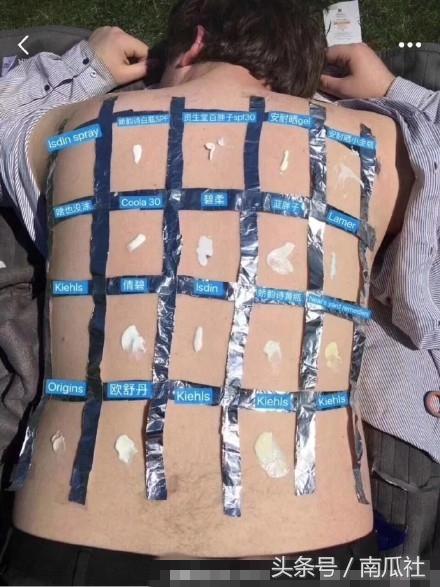 該男子將15種防曬霜分成20格涂在后背,用膠帶隔開,然后在太陽下暴曬,有部位曬紅曬黑后,將膠帶取下驗證15種防曬霜的防曬效果。